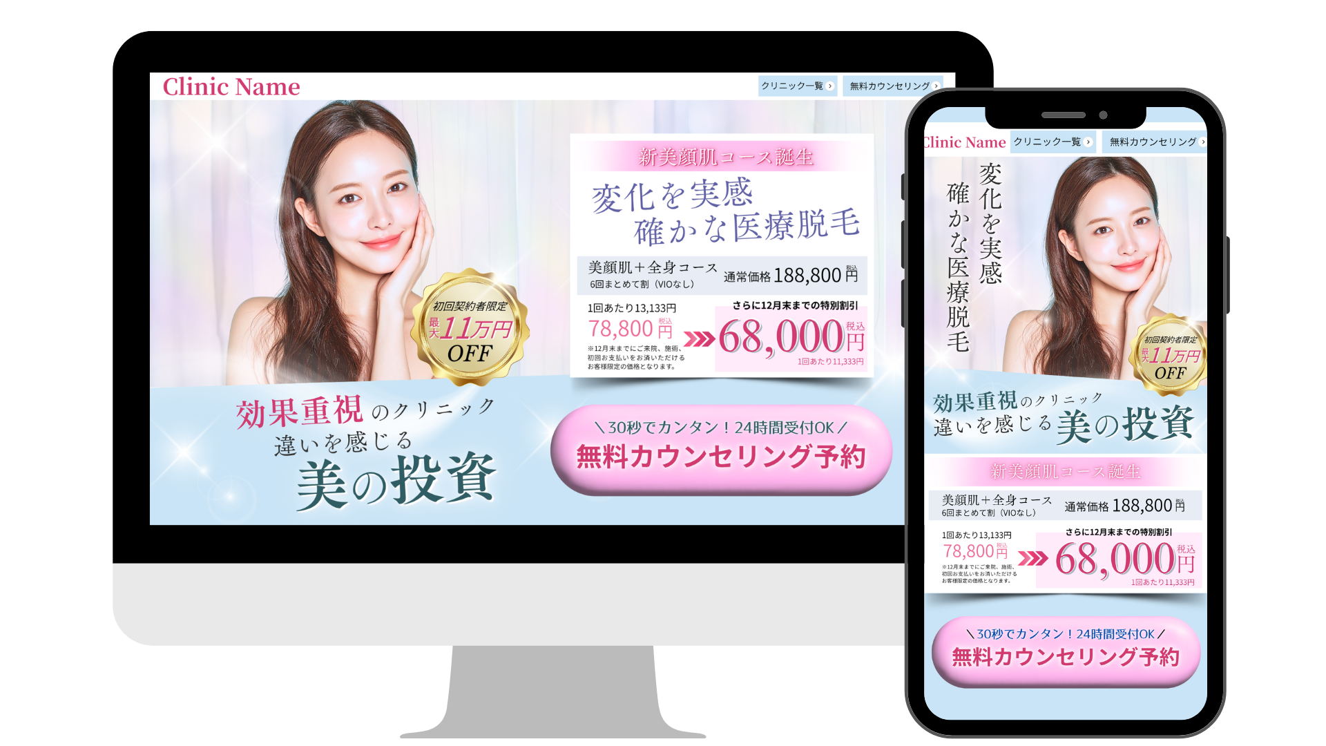 【ターゲット】25~35歳の女性社会人【意識したポイント】早く、確実に、美しく。医療なので安心して通えて、清潔感のあるクリニックを表現